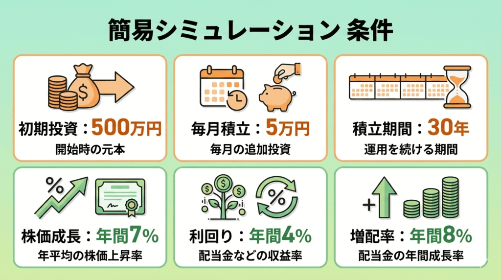 初期投資500万円、毎月5万円積立、年利7%、30年運用した場合のシミュレーション: